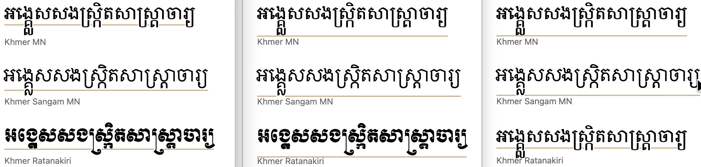 under.Khmer. In the Chrome browser the underline sometimes clears single subjoined consonants, but not always. When there are two subjoined consonants (not very common), the line doesn't clear the bottom of the glyph. Firefox and Safari (only two fonts shown) both clear the bottom of all glyphs. For a typical text, this means that there is a fair-sized gap between the line and the bottom of the glyphs.