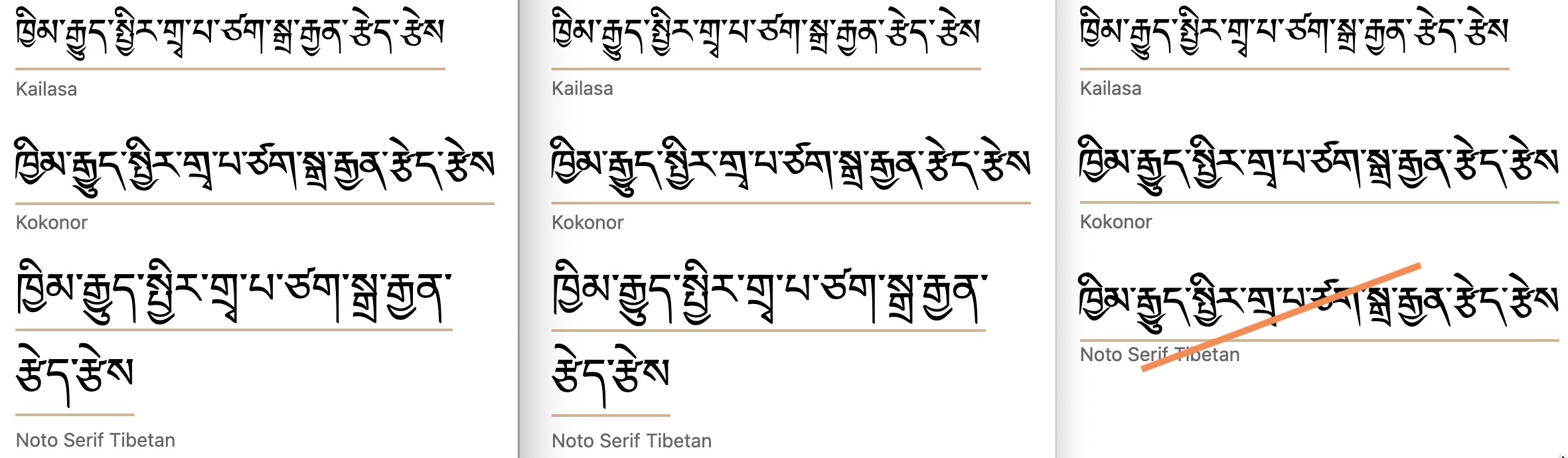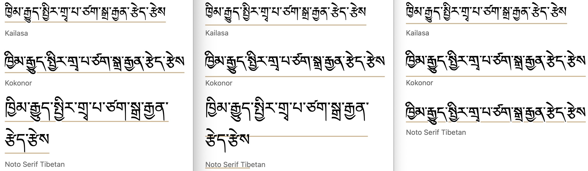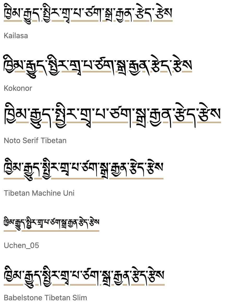 under.Tibetan. Chrome is again more conservative, placing the line just below or bisecting vowels after medial consonants. Firefox and Safari (just the first 2 fonts shown) typically just clear the vowels after medials, but Firefox creates an unexpectedly large gap for Noto Serif Tibetan.