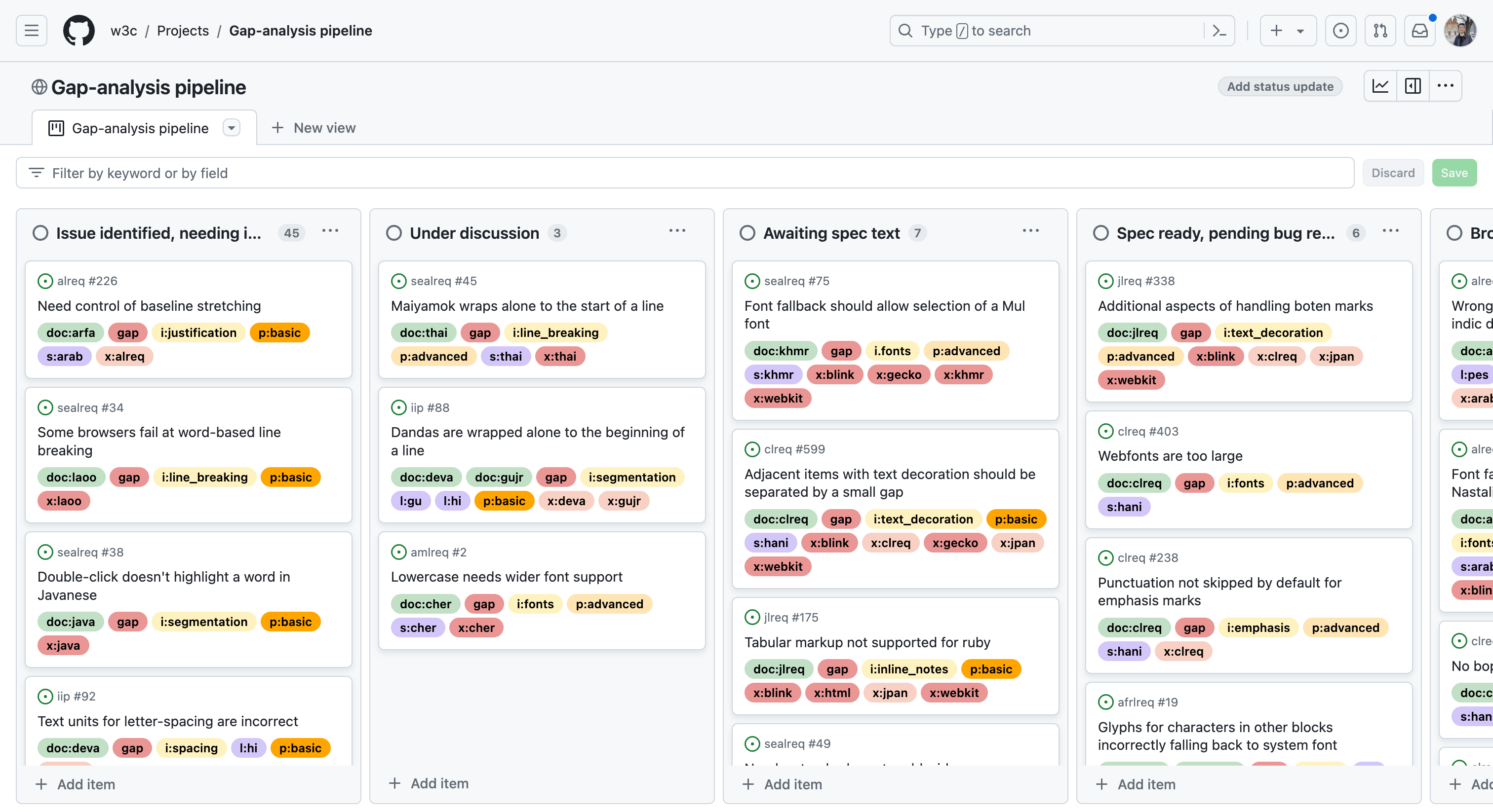- labels to indicate where work is needed to address the issue. These labels all begin with x:. If work is required on a spec, the label will include the short-name for that spec, eg. x:css-text. If a browser bug has been raised, add the name of the browser engine, eg. this will typically be one of x:blink, x:gecko, or x:webkit. If the required fix has been provided, these labels should be removed. That way it is possible to filter the issues in the gap analysis pipeline to see what currently needs attention for a given spec or browser.
