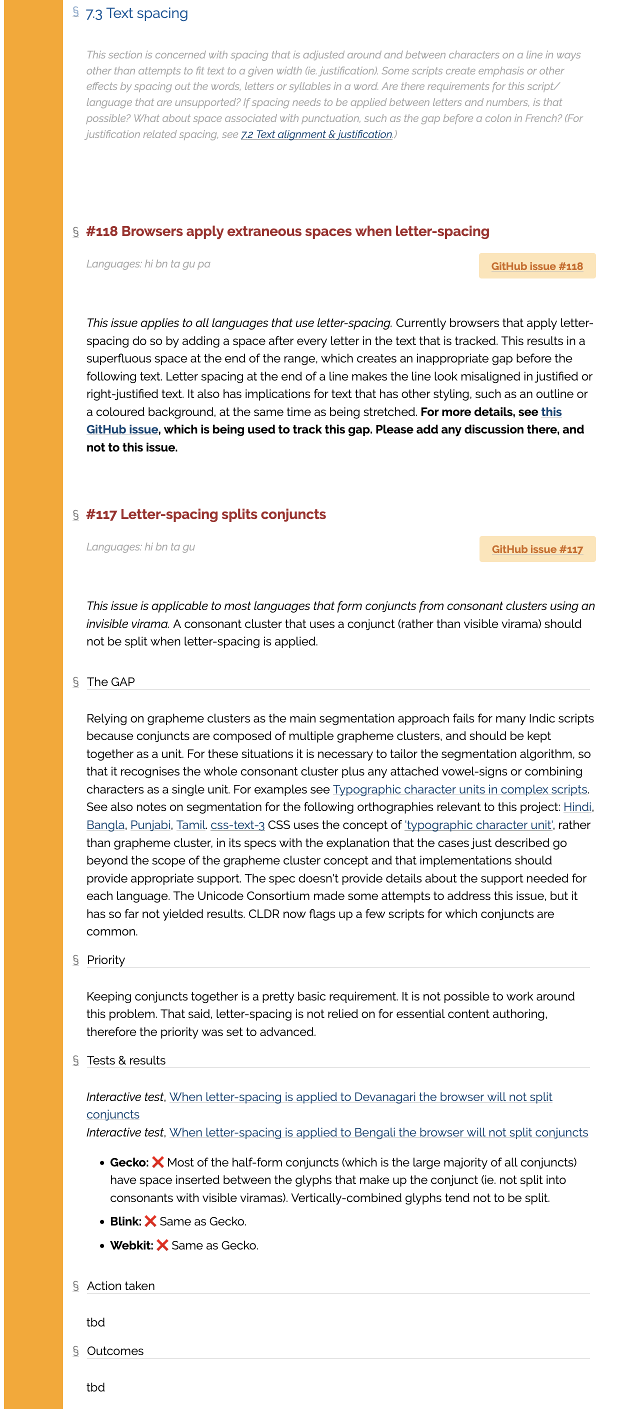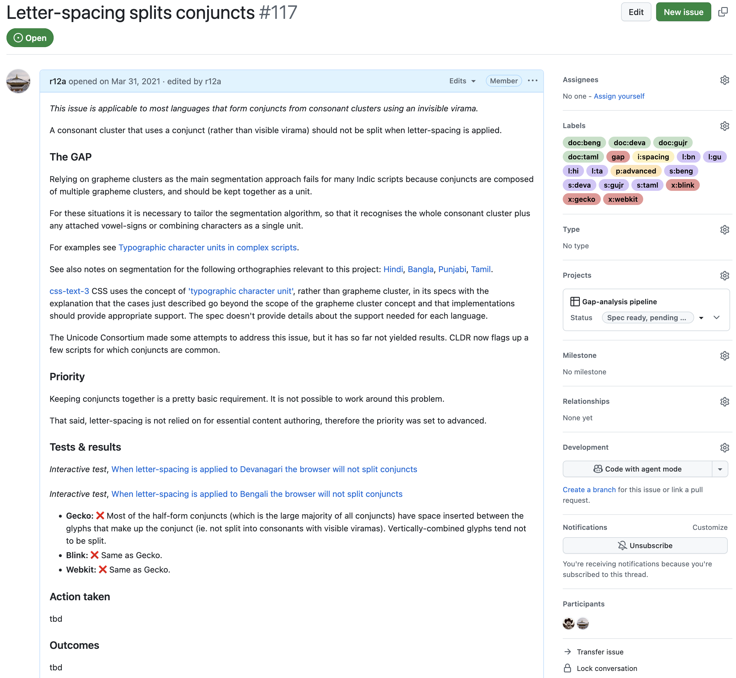 If the same gap applies to multiple documents in the same repository (eg. a letter-spacing issue that applies to Bengali, Devanagari, Gujarati, and Tamil documents, which are all stored in the same indic repository) simply record the information once, with language-specific examples if needed, and apply two or more doc: labels.