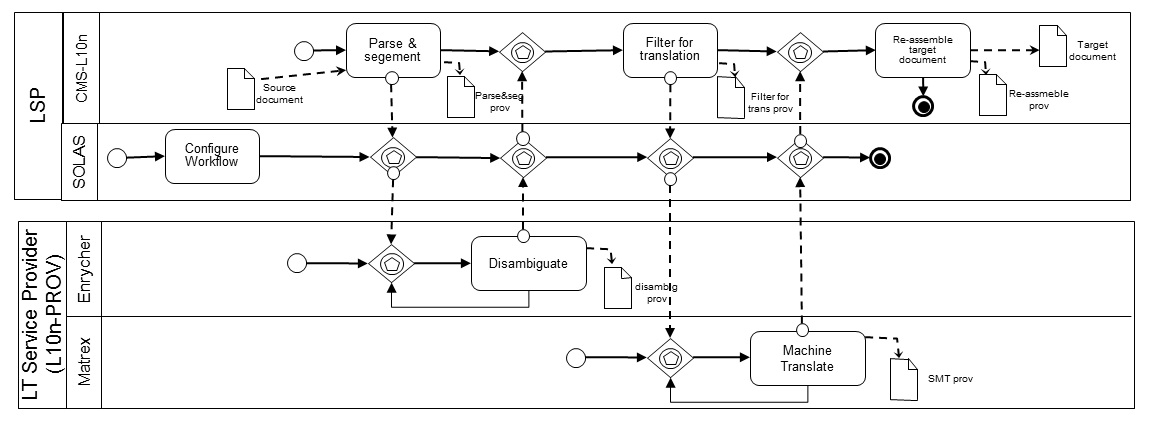 This scenairo extends the scenario presented for the Simple Segment Machine Translation use case which uses: CMS-LION and Segment-level, ITS-aware Matrex SMT Web Service. The direct interaction between these components in this other use case has been replaced with a more general purpose XLIFF workflow system from University of Limerick called SOLAS.