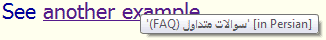 The following example shows how these control characters could be used in plain text. It shows a tooltip in HTML that includes the title of the document linked to (which includes the abbreviation 'FAQ'), plus some text indicating the language of the destination document. Note how the text '(FAQ)' appears to the right of the Persian text. This is incorrect, since it is part of the (right-to-left) document title.