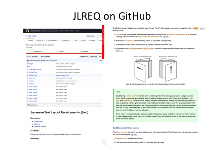Because it is technology agnostic, JLREQ provides a useful base for assessing the state of the Web platform in terms of meeting Japanese publication needs, and is likely to continue to be useful far into the future. Recently, the JLREQ documents (English and Japanese) were ported to the respec format and added to a repository in GitHub, in readiness for any future work, and to make it easier to capture and manage issues with the document.