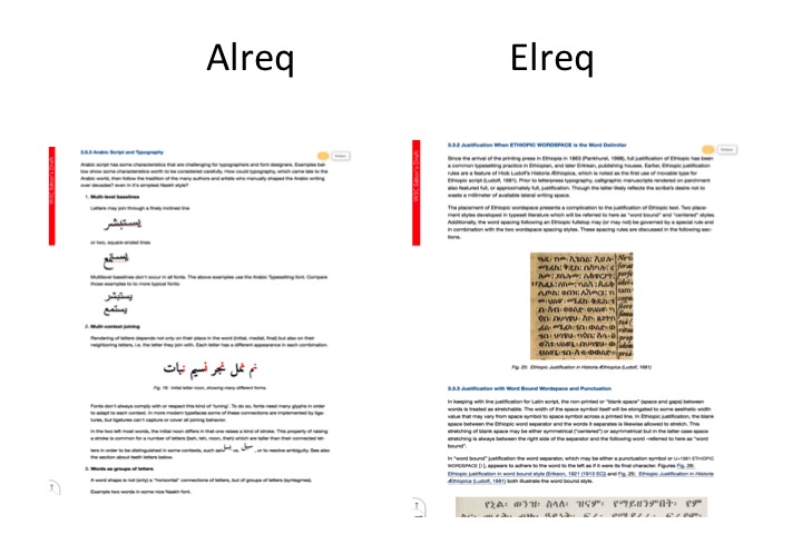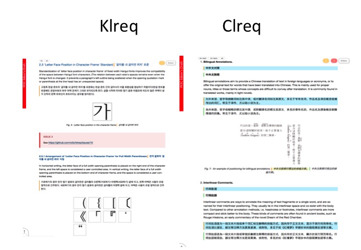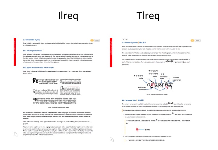 Work is currently ongoing on other script requirements, and similar documents to the flagship JLREQ document are being developed for Chinese, Korean, Indic, Ethiopic, Arabic, Tibetan, Latin and Hebrew scripts. Klreq is Korean, Clreq is Chinese, Alreq is Arabic, Elreq is Ethiopic, Ilreq is Indic scripts, Tlreq is Tibetan (this is still only an early draft). Hlreq, Hebrew, is coming soon