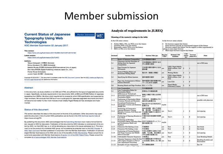 The aforementioned materials and indexes have been useful recently for new standardisation work other than CSS and HTML, that involves features related to Japanese typography. Last year the i18n WG reviewed the WebVTT specification, and we are currently in the middle of discussions with the creators of TTML2 (Timed Text). Both of these specifications attempt to support vertical text and ruby for the Japanese market, but need assistance to ensure that the features specified meet the actual requirements of the Japanese users.