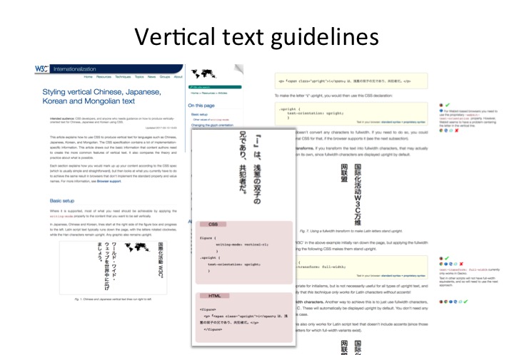 I will now list a number of other recent developments arising from the work of the W3C Internationalization Working Group that also support deployment of features related to Japanese typography.