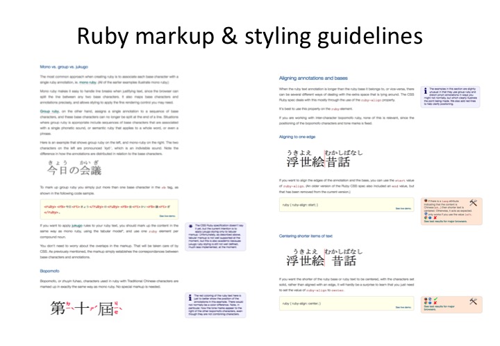 The article Ruby Markup was also recently published by the i18n WG and tells content authors how to code markup for ruby text. Like the article on vertical text previously mentioned, it comes with examples that readers can use to test the behaviour on their browser, and also like that article, work on this article influenced the development of the CSS specification.