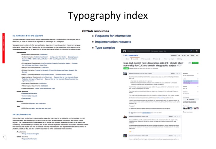 The document not only helps people find information about the requirements of scripts such as those used for Japanese, but it also points to currently open questions about how scripts work (for providers of script requirements), to requests for implementation of features in specs and browsers (for spec and browser implementers). For example, it currently points to a thread asking how text-decoration-skip:ink should be used for ideographic/CJK scripts and another asking how emphasis marks should behave in relation to auto-hidden ruby. This provides, for the first time, a way of tracking currently open questions about how a particular script works, and also the status of implementation requests for that script.