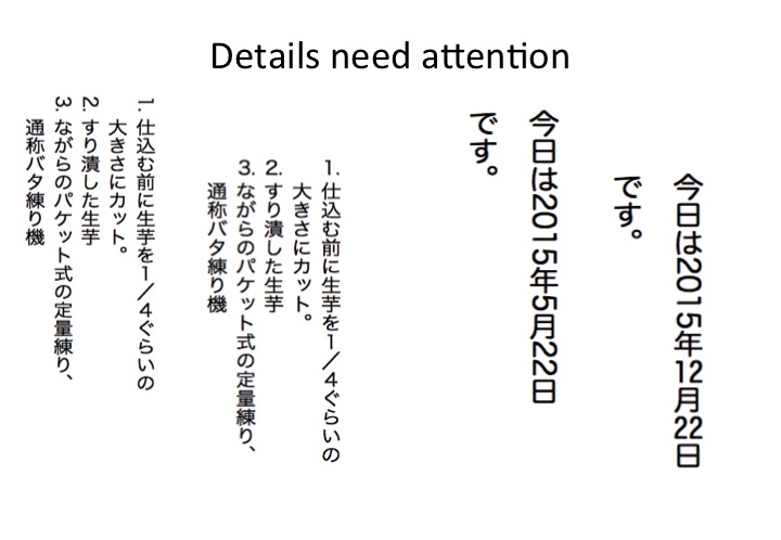 For example, a workshop was held in Tokyo in 2013 entitled eBooks & i18n: Richer Internationalization for eBooks, where the audience was largely Japanese, and the list of prioritised issues in the report signalled that the top two concerns for workshop participants were support for vertical text and ruby. Other high scoring topics were the development of other requirements, similar to JLREQ, for other scripts, and better support for line-breaking rules, nakiwakare, and tate chu yoko.