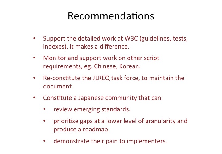 I therefore recommend that we continue to analyse where the gaps are in Japanese feature support, but do so at a more detailed level; that we then prioritise and make the case for addressing those gaps, and do so at a more granular level than before; and that we find some way to show where the pain points are for users, content authors and developers, so that implementers are persuaded to incorporate missing but needed features in browsers and ereaders.