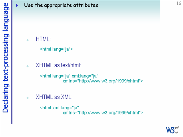 When serving XHTML as text/html, you should use both the lang attribute and the xml:lang attribute. The xml:lang attribute is the standard way to identify language information in XML. The following example shows how you would mark up the previous example for XHTML 1.0 served as text/html.