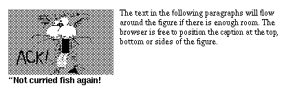The FIG element is similar to the IMAGE element, but acts as a paragraph. The ALIGN attribute can be one of LEFT (the default), CENTER, RIGHT or FLOAT. This determines whether the figure is flush left, centered or flush right. If ALIGN=FLOAT the figure may float to another more convenient location (and possibly zoomed or reduced in the process). A caption can be defined with the CAPTION element and followed by text describing the figure for readers using text only displays*1:
