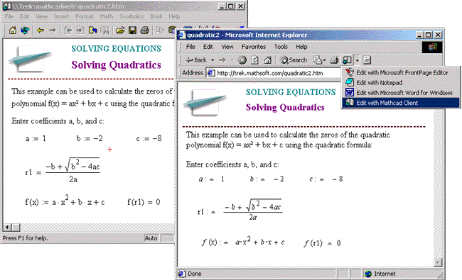 Mathcad, by Mathsoft Engineering & Education, Inc., is a leading calculation and technical documentation tool for professional and educational users. Mathcad uses standard math notation as its interface. Files can be saved as dual-purpose web documents, incorporating both presentation and semantic forms of MathML. They can be viewed on the web using IBM techexplorer Hypermedia Browser and reimported from the web by Mathcad as live mathematical documents. Below, the same document is shown in Mathcad and a web browser equipped with IBM techexplorer Hypermedia Browser. The image shows how Mathcad can be launched directly from the browser for further editing and calculation of the MathML document.