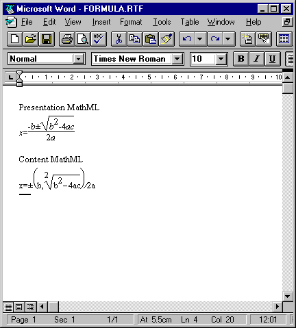 These parse both Content and Presentation MathML (although currently do not support the definition element). Using Jade one may render MathML to TeX or to rtf. The screenshots show the same example, viewed with the TeX previewer, xdvi, and in Microsoft Word. In these early versions of the scripts, some typographic aspects, especially for Content MathML, are not as you might expect. However being based on a full SGML system which is using the MathML DTD, the scripts do parse the full MathML language.