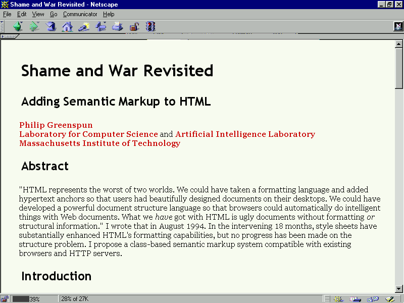 In the previous discussion we have demonstrated that simple HTML documents, augmented with style sheets, preserve device independence and accessibility, while improving network performance. If you publish documents on the Web, the ubiquitous HTML is likely to be your document format of choice for years to come.