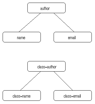 Figure 2. Example A shows element containment within an SGML document instance. Example B shows how the similar containment hierarchy can be achieved by complementing HTML semantics with the CLASS attribute.