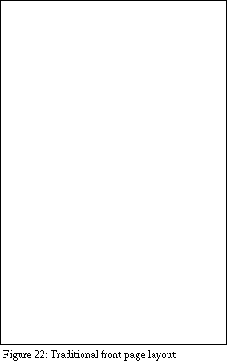 defines a template grammar that describes the set of legal templates. The purpose of the grammar is to outlaw templates that should be avoided. The descriptive grammar consists of a small set of rules, e.g., "The shape of a template must never become larger as one scans from top to bottom." A large number of templates are in the set of legal designs, from which the template to be used is selected in a semi-random way.9.3 The Layout of the Electronic Broadsheet