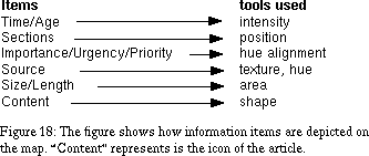 Since electronic newspaper maps don't have the same traditions, a significant part of the project has been dealing with the design of the map. There is a number of information items that readers may be interested in learning about without having to look at the actual article. There is also a limited number of design tools one can use to convey a message from the surface of a computer screen to the reader.