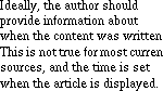 , or one can use the absolute calendar as a reference ("the article was received Apr 2, 9:38pm"). The first representation is more useful in the short term, while only the second is acceptable for archives. Since newspapers by definition emphasize the short term, the first representation is most useful in this project. If the goal was to create a research tool to search through news archives, the time/date would be the natural solution.