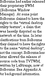 Dave Edmondson of Imperial College modified the freely available source code for TWM to add the virtual feature. The new version, called VTWM (Virtual TWM), was made available in the summer of 1990 and quickly gained popularity. It was the first free window manager with virtual features.