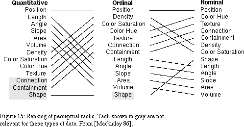 ranks the design tools as perceptual tasks with regard to how well they perform presenting quantitative, ordeal and nominal data. See figure 15. The data have not been empirically confirmed, and should be used with care. However, we can make a number of interesting observations from it: