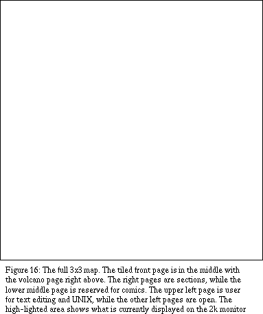 In The Electronic Broadsheet, sections are currently laid out in a 3x3 two-dimensional grid with the front page in the middle. The surrounding pages each contains a section with topics similar to those found in traditional newspapers. This layout limits the number of sections to a maximum of 8. If the user wants to use some of the virtual space for other applications, the number decreases further. As discussed in section 7.1, six is a good guess for how many sections an average reader wants. However, this number may increase when huge amounts of information become available. Changing the number of section pages will change the scale of the map. Also, if the number of section pages is increased, each section will no longer border the front page.