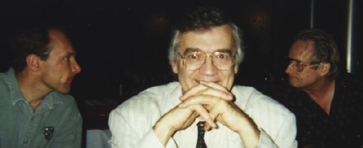 From left to right, the picture depicts Tim Berners-Lee, Robert Cailliau and Ted Nelson. Tim and Ted are clearly talking behind Robert's back, but Robert doesn't seem to mind. Maybe because he had just presented his latest theory about religion in Europe, and -- given that scale -- even hypertext theories fall short.