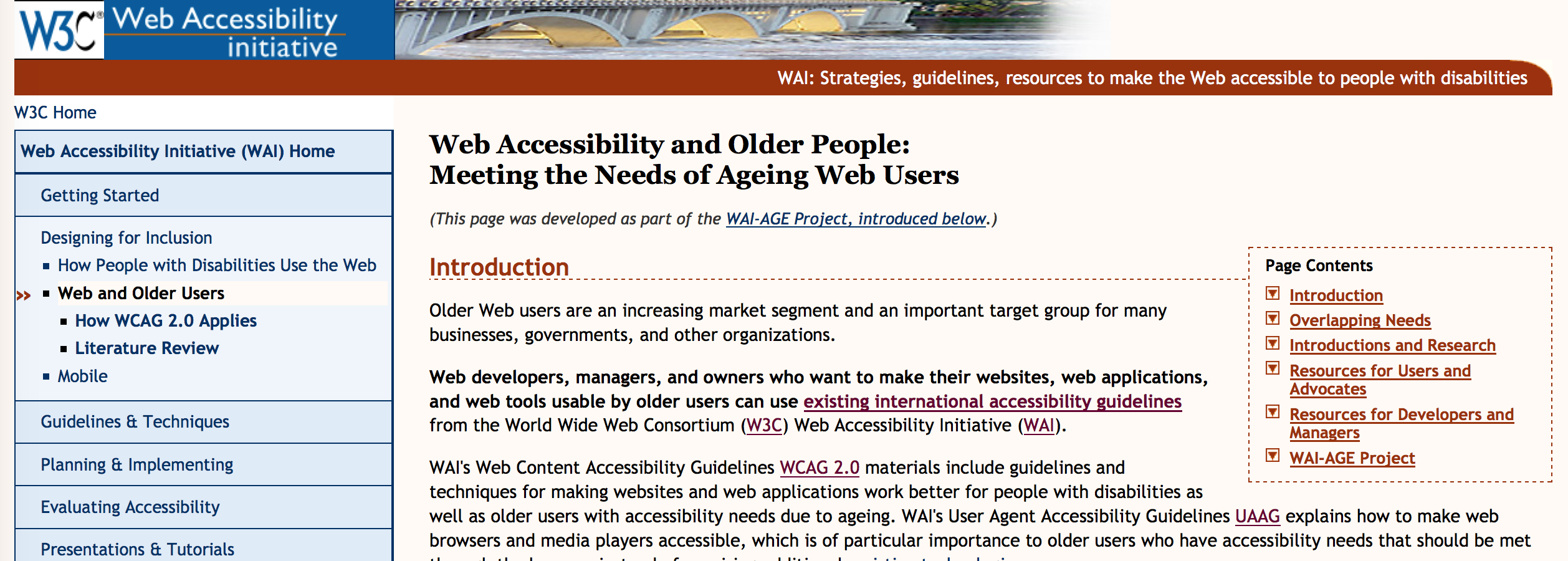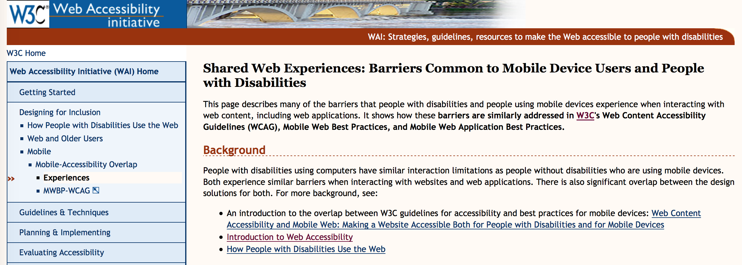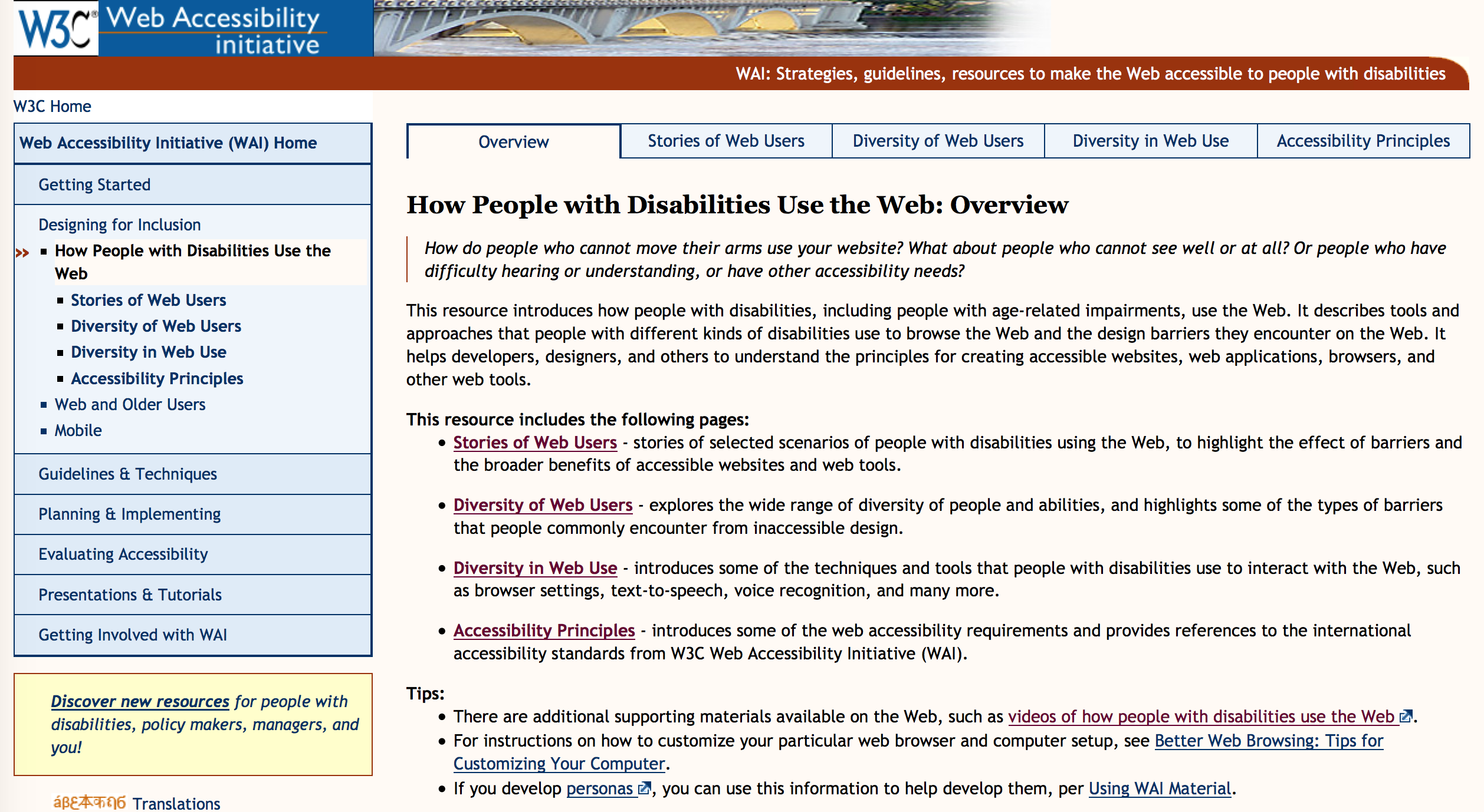 W3C Web Accessibility Initiative (WAI) develops strategies, guidelines, resources to make the Web accessible for people with disabilities.