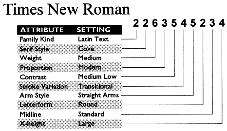The key to the PANOSE system is the PANOSE Typeface Classification Number, a compact 10-byte description of a font's critical visual characteristics, such as contrast, weight, and serif style. PANOSE numbers are stored in TrueType fonts from many leading font foundries, and in files created by PANOSE-aware applications. The ten classification attributes are: