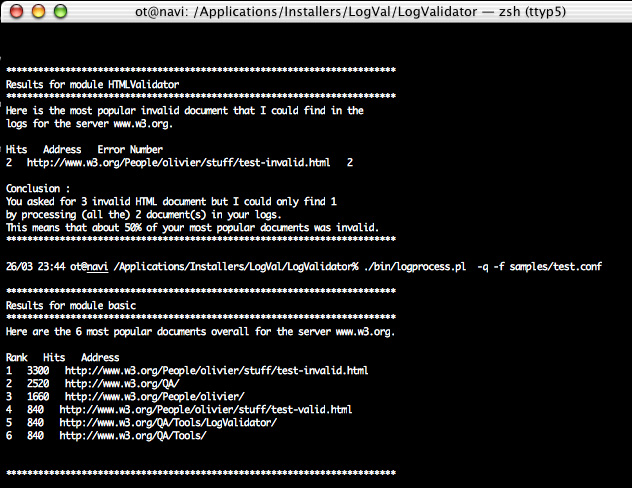 Here's the output for the Log Validator in its "default" behaviour, running on a "random" Web Site and giving the most popular documents and most popular invalid HTML documents on the site.