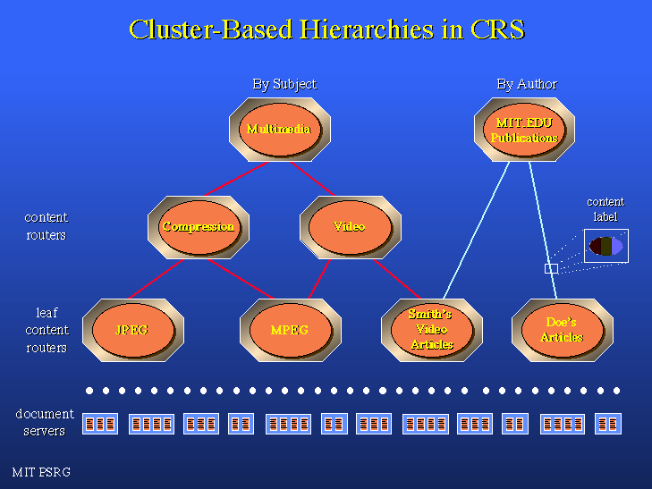 Hierarchical organizations of information servers, such as content routing systems, provide a framework for distributed searching and browsing in large information spaces. Such hierarchies, as shown in the figure, consist of documents stored on document servers (e.g., Web sites) and information servers that organize and index documents and other information servers. Experience with several prototype content routing systems, including CRS-WAIS, Discover, and HyPursuit has led us to believe that effective search engines must provide a spectrum of browsing and searching capabilities, together with facilities for helping users focus queries. We have also learned that underlying metadata representations of server contents are critical to providing scalable implementations for high level information services.