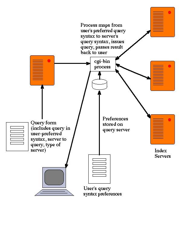 An architecture incorporating client query proxies can address many of the problems inherent in a distributed network of search engines. The query proxy can use HTTP/HTML to communicate with the user. Each user registers with the proxy server and provides information on his/her query syntax preferences. The preferences are stored on the query proxy, and discarded after a preset period of inactivity. When the user issues a query, the syntax is based on that user's preferences. The query submission also includes the server to search. The proxy then launches a process that contacts the server, downloads (and optionally caches locally) that server's query syntax, performs mapping from the user's syntax to the server's syntax, and issues the query. Query results are returned to the proxy, and passed back to the user. A block diagram of the architecture is available separately.