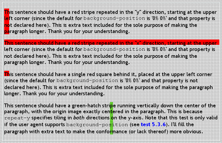 This sentence should have a green-hatch stripe running vertically down the center of the paragraph, with the origin image exactly centered in the paragraph. This is because repeat-y specifies tiling in both directions on the y-axis. Note that this test is only valid if the user agent supports background-position (see test 5.3.6). I'll fill the paragraph with extra text to make the conformance (or lack thereof) more obvious.