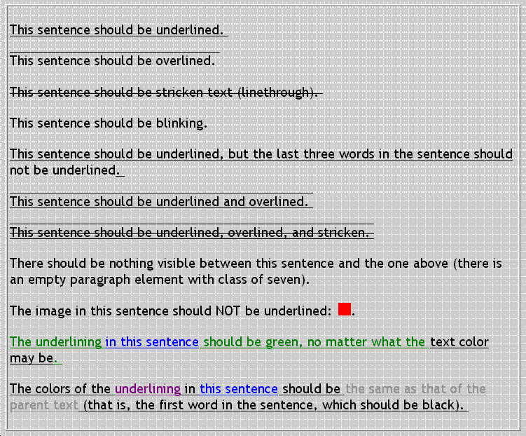 This sentence should be underlined. This sentence should be overlined. This sentence should be stricken text (linethrough). This sentence should be blinking. This sentence should be underlined, but the last three words in the sentence should not be underlined. This sentence should be underlined and overlined. This sentence should be underlined, overlined, and stricken.