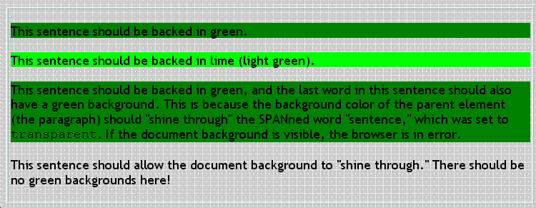 This sentence should be backed in green, and the last word in this sentence should also have a green background. This is because the background color of the parent element (the paragraph) should "shine through" the SPANned word "sentence," which was set to This sentence should allow the document background to "shine through." There should be no green backgrounds here! |