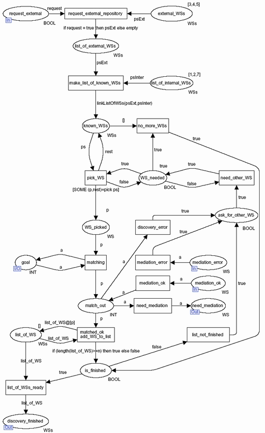 First, a list of known_Web_Services is created by combining internally known Web services with external ones in case the service requester wants to check them too. From this list, one Web service is picked and an attempt made at matching. If necessary, mediation is requested, by placing a token in the place need_mediation. This mediation may succeed, after which the matching can continue. The mediation may also fail, after which a new Web service is needed (the chosen Web service cannot be mediated, and is useless for this goal).