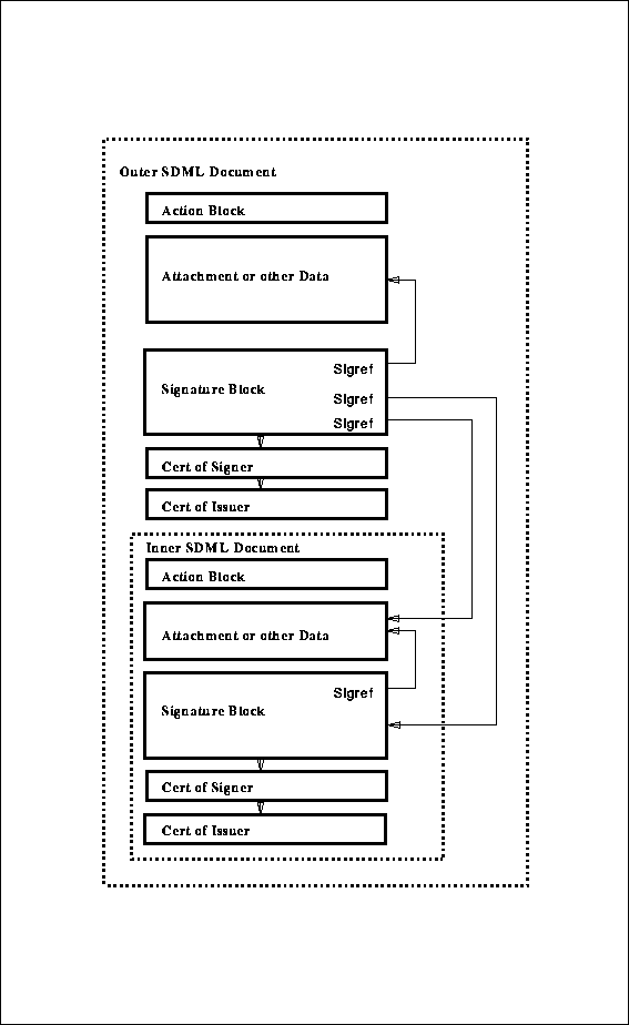 The concept of the SDML electronic document is that it is a flexible structure. Separating signatures, certificates, actual data, etc., into separate blocks allows a rich, complex document to be built from these "primitives," while retaining a standard format which can be parsed and verified according to a standard syntax definition.