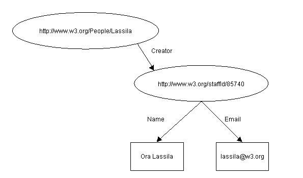 The intention of this sentence is to make the value of the Creator property a structured entity. In RDF such an entity is represented as another resource. The sentence above does not give a name to that resource; it is anonymous, so in the diagram below we represent it with an empty oval: