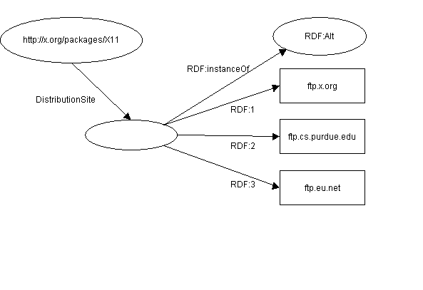 To create a collection of nodes c, create a triple {RDF:instanceOf, c, t} where t is one of the three node types RDF:Seq, RDF:Bag, or RDF:Alt. The remaining triples {RDF:1, c, r1}, ..., {RDF:n, c, rn}, ... point to each of the members rn of the collection. There may be at most one arc from a single collection node labeled with each element of Ord and the elements of Ord must be used in sequence starting with RDF:1. For nodes that are instances of the RDF:Alt collection type, there must be exactly one member whose arc label is RDF:1 and that is the default value for the Alternatives node (that is, there must always be at least one alternative).