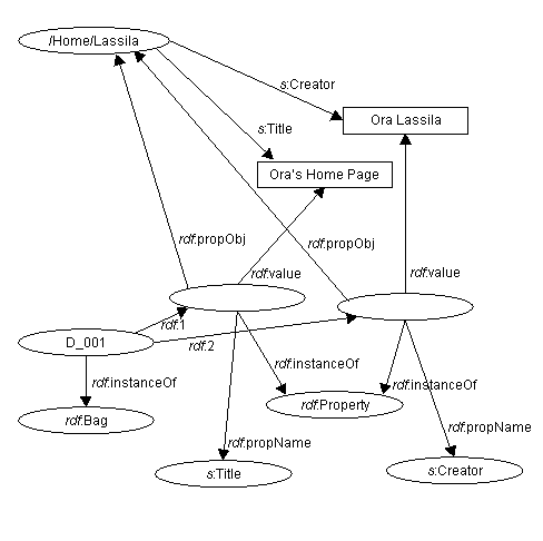 Note: The direction of the arrow is important. The arc always starts at the resource and points to the value. The simple diagram above may also be read "http://www.w3.org/Home/Lassila has creator Ora Lassila", or in general "<resource> HAS <property type> <value>".