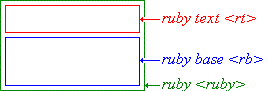 In a UA that supports ruby, the ruby structure consists of three boxes. The outermost container is the ruby element itself. It is a container for two non-overlapping boxes: the ruby text box and the ruby base box.
