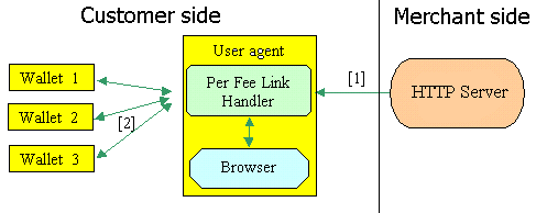 This document specifies the encoding of per-fee-links inside HTML page sent from the merchant to the consumers browser. The specification does not describe the specific transport mechanism of the HTML page, although we expect that HTTP will be used as it is the transport mechanism used by existing browsers. In particular, the specification does not address security concerns related to the transmission of the per-fee-link from merchant to client, such as authentication of the parameters in the per-fee-link (such as price) and confidentiality of the per-fee-link. If such security concerns exist, the application SHOULD use appropriate mechanisms, e.g. protect the confidentiality and authenticity of all communication between consumer and merchant using the Secure Sockets Layer [SSL] (HTTPS) protocol.