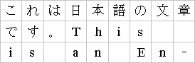 The diagram below represents a fragment of horizontal text on a page with mixed wide-cell and narrow-cell glyphs that a Japanese user intended to be laid out on a grid which resulted in 9 glyphs per line (gray grid lines shown for clarity):