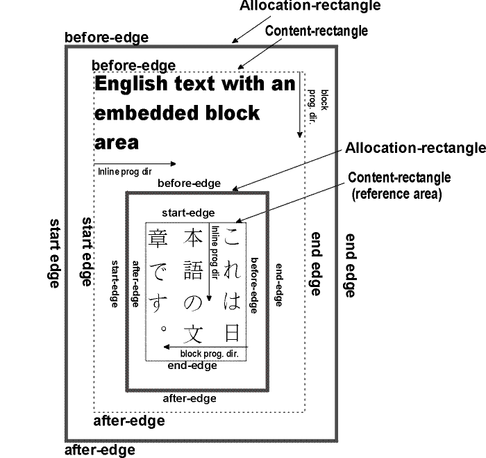 For this reason XSL (and before it DSSSL) uses a relative frame of reference for the formatting object and property descriptions. Just as the CSS2 frame of reference has four directions (top, bottom, left and right), so does the XSL relative frame of reference have four directions (before, after, start, and end), but these are relative to the "writing-mode". The "writing-mode" property is a way of controlling the directions needed by a formatter to correctly place glyphs, words, lines, blocks, etc. on the page or screen. The "writing-mode" expresses the basic directions noted above. There are writing-modes for "left-to-right - top-to-bottom" (denoted as "lr-tb"), "right-to-left - top-to-bottom" (denoted as "rl-tb"), "top-to-bottom - right-to-left" (denoted as "tb-rl") and more, see [7.35.7 "writing-mode"] for the description of the "writing-mode" property. Typically, the writing-mode value specifies two directions, the first is the inline-progression-direction which determines the direction in which words will be placed and the second is the block-progression-direction which determines the direction in which blocks (and lines) are placed one after another.