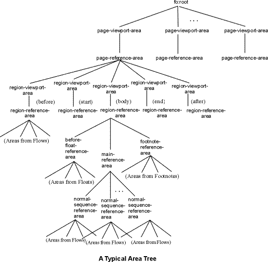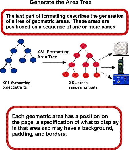 To summarize, formatting proceeds by constructing an area tree (containing areas and their traits) which satisfies constraints based on information contained in the XML result tree (containing element nodes and their attributes). Conceptually, there are intermediate steps of constructing a formatting object tree (containing formatting objects and their properties) and refinement; these steps may proceed in an interleaved fashion during the construction of the area tree.