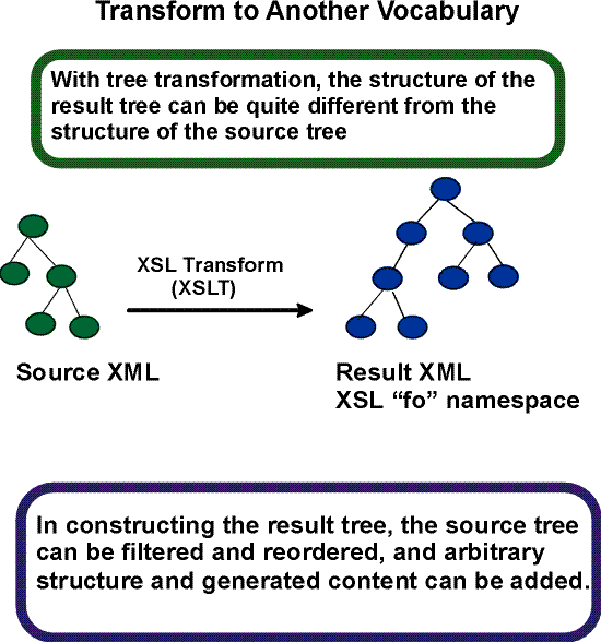 Tree transformation allows the structure of the result tree to be significantly different from the structure of the source tree. For example, one could add a table-of-contents as a filtered selection of an original source document, or one could rearrange source data into a sorted tabular presentation. In constructing the result tree, the tree transformation process also adds the information necessary to format that result tree.
