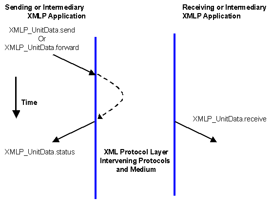 Conceptually the XMLP_UnitData operation encapsulates the transmission of an XML protocol message from a sending XML protocol application to a receiving XML protocol application. The principal conceptual difference between sending and forwarding an XML protocol message is that, from a message correlation point of view, sending generates a new message whereas forwarding passes on an existing message. Conceptually the forwarded message is the same message as previously received although the action of intermediary processing may have changed the value of the message.