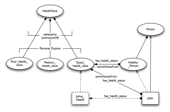 In this approach, the class Health_Value is considered as the enumeration of the individuals good_health, medium_health, and poor_health. Values are sets of individuals. To say that "John is is in good health", is to say that "John has the value good_health for health_status" This assumes that a value is just a unique symbol, and a value set is just a a set of such symbols. Normally, the values will all need to be asserted to be different from each other. In OWL, any two individuals might represent the same thing unless there is an axiom to say, explicitly, that they are different. In other words, OWL does not make the "Unique Names Assumption". If we did not include the differentFrom axiom in the example, then it would be possible that good_health and poor_health  where the same thing, so that it would be possible to have a person who was both in good health and poor health simultaneously.
