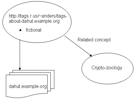 The word "fictional" is not very useful without context, so to enable such user-defined tags to be shared with others, tags.r.us allows users to assign a link between their own tags and a Description Resource, that provides the context that it is about an alleged fictional animal. An agent can thus use the tag as appropriate, processing the explicit semantics provided by the DR but perhaps presenting other users with Anders' original tags.
