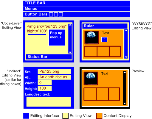Note on examples: For illustrative purposes, the techniques document includes examples, many containing mock screenshots (the mock screenshots have all been created by the Working Group to avoid being seen to favor a particular product). While the examples have been chosen to be as informative as possible, many of them are specific to certain types of authoring tool functions. In order to assist developers in determining the relevance of the examples to the different categories, each is marked with one or more of the following category icons (Note: A particular tool may fall more than one category. For example, an HTML editor might have both a code-level editing view and a WYSIWYG editing view):